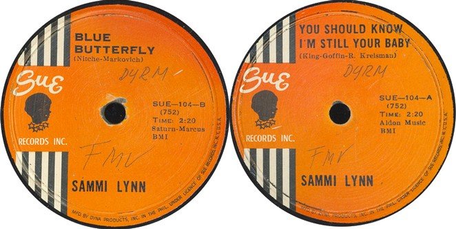 There are only 4 known Sue 78 rpm-Dyna Products pressings; the latest one just discovered in the Philippines is by the lovely Miss Sammi Lynn, her coupling of "You Should Know I'm Still Your Baby/Blue Butterfly" with label matrix Number Sue-104 (752). (The 752 number is the actual U.S. release number)